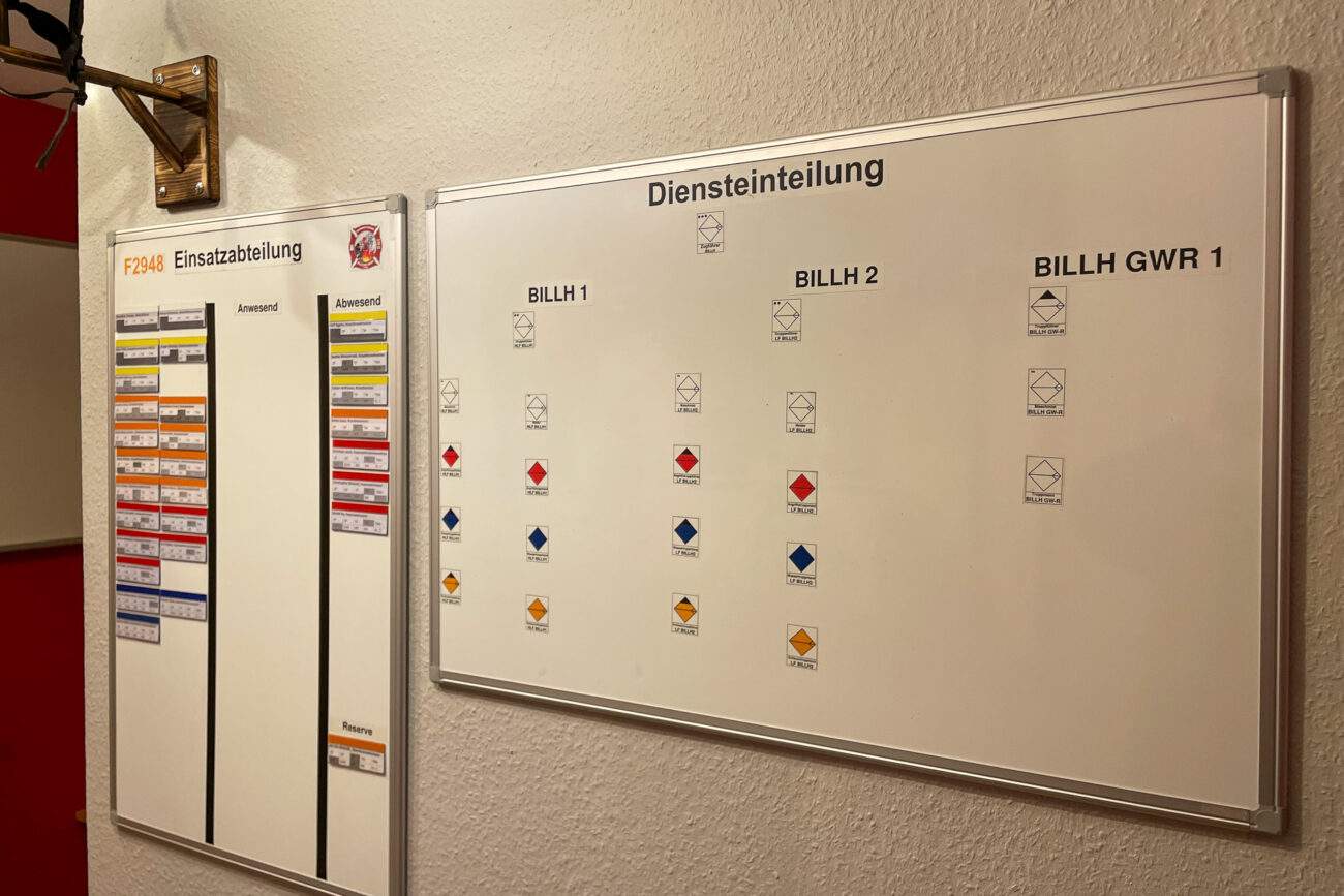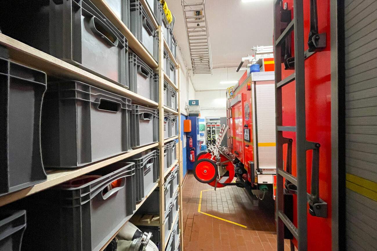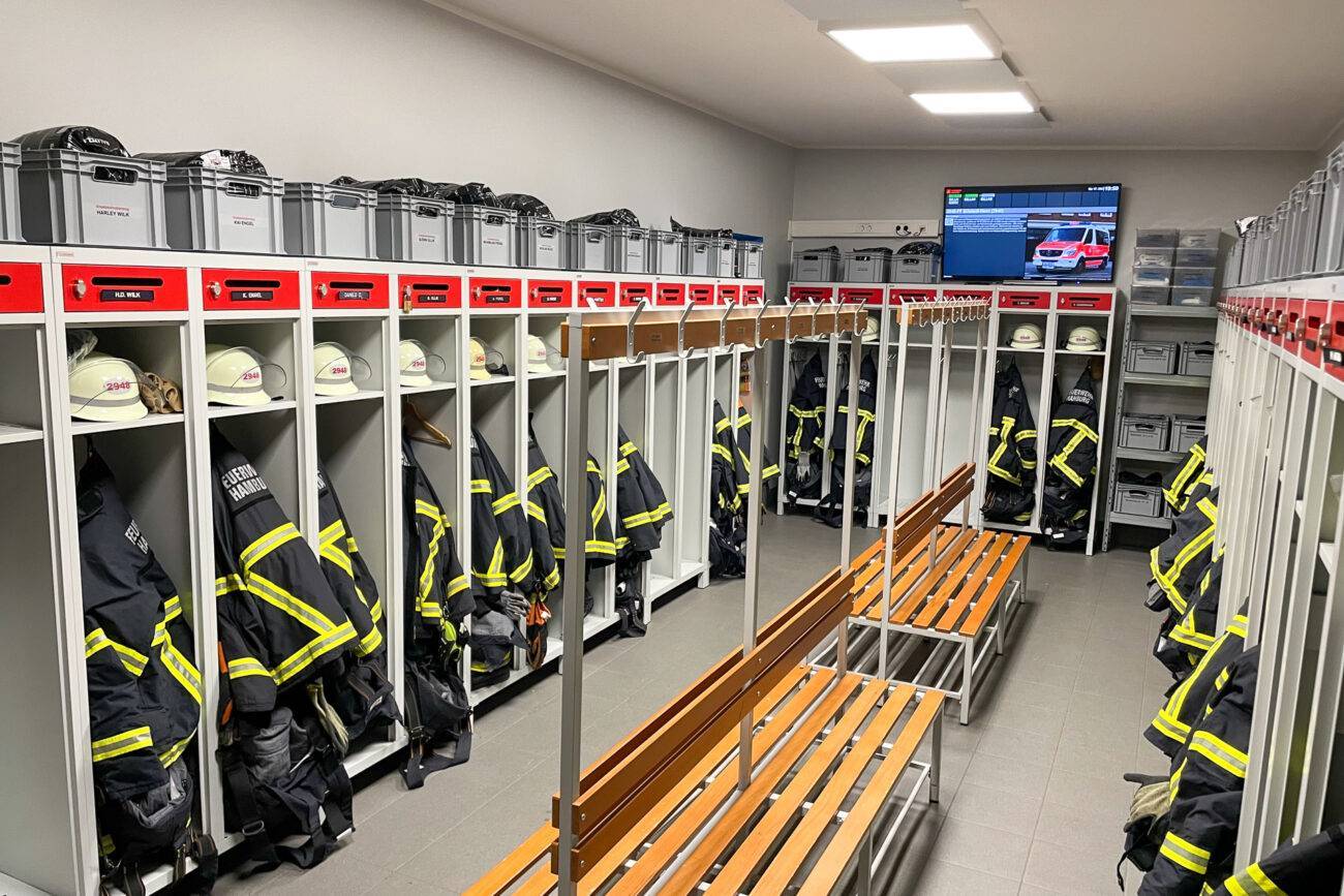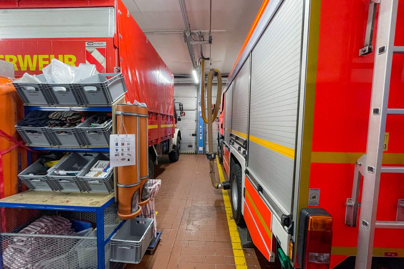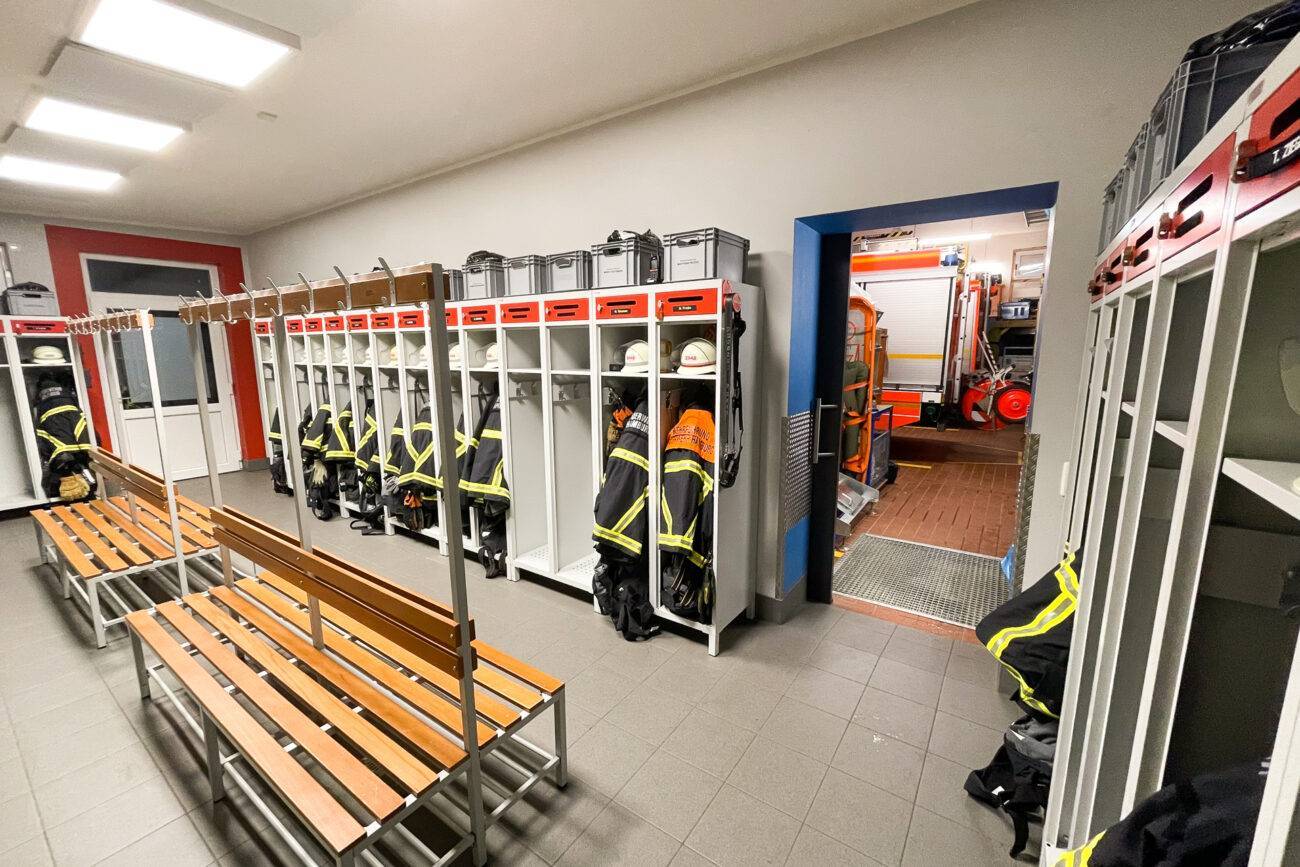 Jedes Fahrzeug hat in der Fahrzeughalle seinen eigenen Einstellplatz mit Abgasabsauganlage und elektrischer Torausfahrt. Zudem wurde ein Umkleideraum angebaut. Somit müssen wir uns nicht mehr innerhalb der Fahrzeughalle umziehen, während die Fahrzeuge noch in der Halle stehen. Der separate Raum bedeutet ein Plus an Sicherheit für die Einsatzkräfte und garantiert somit ein schnelles Ausrücken. Es ist gelungen u.A. mit der selbstgebauten Stiefelwaschanlage und separaten Räumlichkeiten für kontaminierte Einsatzkleidung, eine perfekte hygienische Trennung, von eingesetzter und gereinigter Kleidung zu gewährleisten. Für die Einsatzhygiene der Kameradinnen und Kameraden gibt es zwei Duschräume, zudem wird Duschzeug vorgehalten.