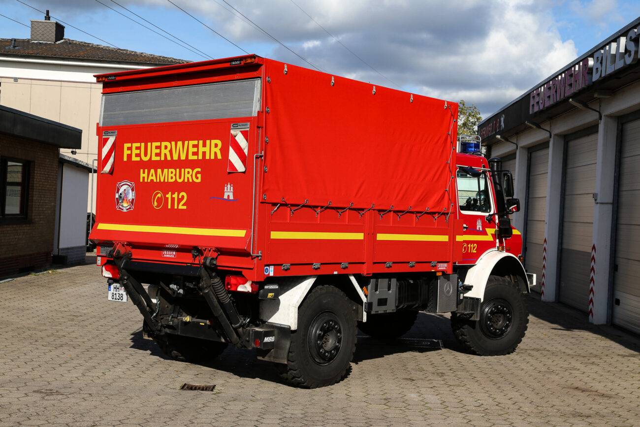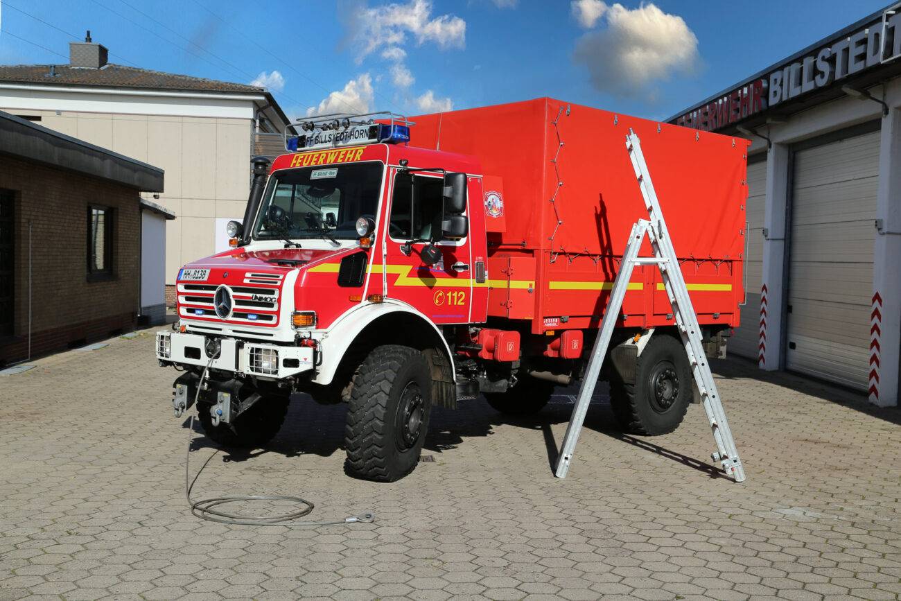 Mit dem GW-Rüst1 (Gerätewagen-Rüst) auf einem Mercedes-Benz Unimog-Fahrgestell verfügen wir über eines dieser hamburgweit 7 Sonderfahrzeuge, die als spezielle Rüstkomponente vorgehalten werden. „Florian Hamburg Gerätewagen-Rüst 1“steht für eine Vielzahl möglicher Einsätze bereit. Die Ausstattung für die Bereiche schwere, technische Hilfeleistung, Pumparbeiten, Beleuchtung und Bergungsaufgaben ist auf Rollcontainern verlastet und bietet so hohe Flexibilität, fest eingebaut ist eine Seilwinde. Weitere Besonderheiten zeigen sich im Sommer und im Winter. Für den Fall einer Schneekatastrophe, bei der Straßen aufgrund der Schneemengen nicht mehr befahrbar sind, kann unser GW-Rüst 1 mit einem Schneeräumschild ausgestattet werden und den Einsatzfahrzeugen den Weg frei machen. Im Sommer hingegen steigt vermehrt die Gefahr von Wald-und Flächenbränden. Derartige Einsätze können mit unserem Fahrzeug auch bewältigt werden, indem Wassertanks und eine Tragkraftspritze auf der Ladefläche montiert werden. Somit steht uns neben den beiden Standard-Löschfahrzeugen ein hoch geländegängiges und flexibles Einsatzfahrzeug für besondere Einsatzlagen zur Verfügung.